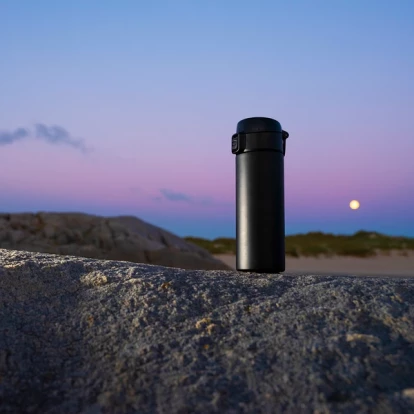 Utrzymuje temperaturę powyżej 40°C przez 16 godzin. Szczelne zamknięcie typu leak proof. Dwie ścianki ze stali nierdzewnej, zarówno wewnątrz jak i na zewnątrz zastosowano stal nierdzewną 18/8 o podwyższonej jakości. Podstawa kubka z silikonu.