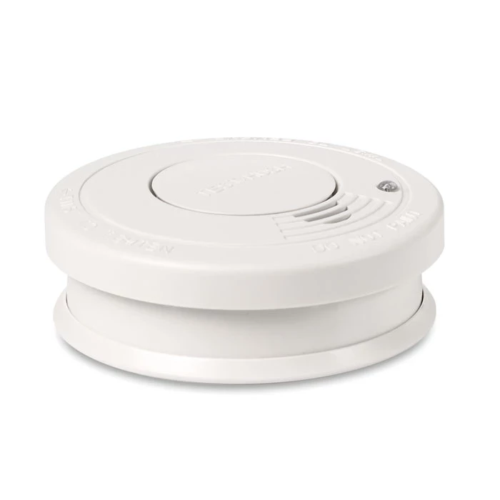 Wykrywacz dymu w plastikowej obudowie. Czerwona lampka świeci się, gdy urządzenie pracuje. W komplecie 2 śrubki do montażu. 1 bateria 9V dołączona.