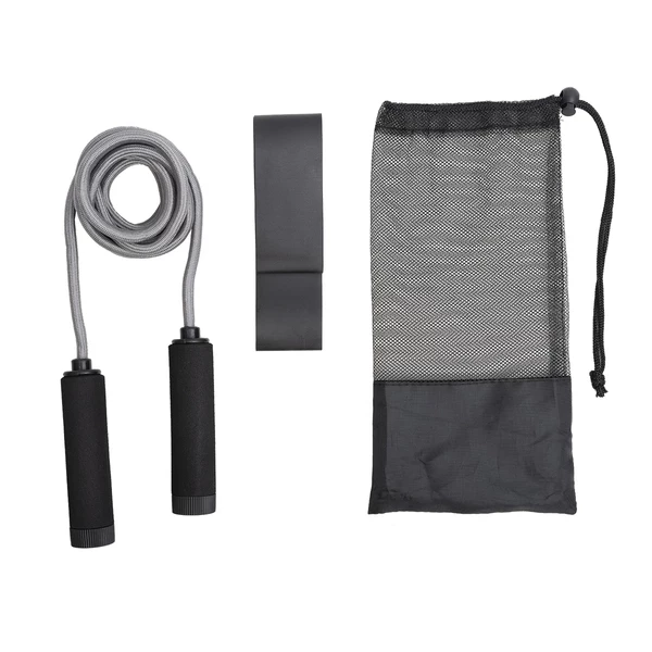 Zestaw do fitness składający się ze skakanki, taśmy oporowej (średni opór), etui oraz ulotki z zestawem ćwiczeń. Długość skakanki jest regulowana.